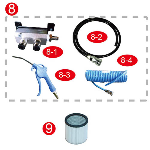 成品內部過濾耗材: 5) 紙過濾SH-180 (Φ188*H180mm/橘/紙)*1只 6) 布過濾袋(布A) *1只 7) 124集塵布袋(830*350mm / H13過濾等級/白) (吸粉塵用)*1只 ………………………………………………………………………………………………………………………………………… 選購配件: 8)