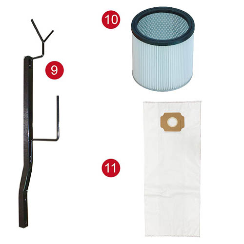 B型軟管架*1組(6-A) 成品內部過濾耗材: 7) 紙過濾SH-180 (Φ188*H180mm/橘/紙)*1只 8) 布過濾袋(布A) *1只 ………………………………………………………………………………………………………………………………………… 選購配件: 9) Y型軟管架*1組(選配) 11) 高密度過濾*1只(選配) 12) 124集塵布袋(830*350mm / H13過濾等級/白) (吸粉塵用)*1只(選配) ………………………………………………………………………………………………………………………………………… |