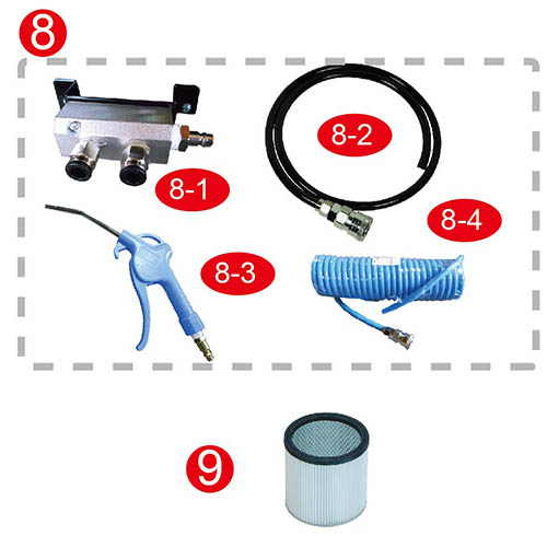 附有軟管掛鉤,可供軟管及電線便於收納,增設洞洞板上單勾可放置砂紙,增加 9) 有CE認證,讓產品有最大的安全保證。 10) 增加高壓型除塵風槍,讓使用者便於清潔物品。(選配) …………………………………………………………………………………………………………………………………………. |