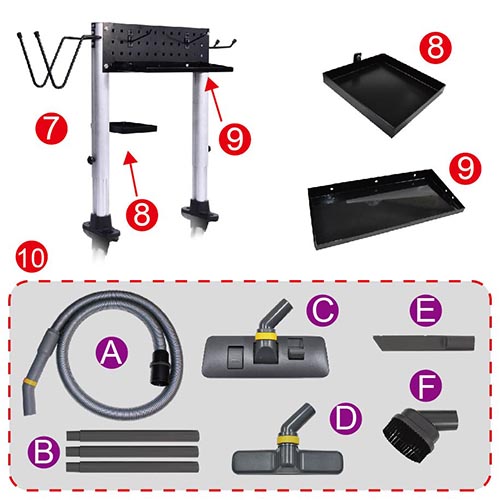集塵管(5M)*1條 成品內部過濾耗材: 2) 124 集塵布袋(830*350mm / H13過濾等級/白) *1只 3) 方形過濾器/吸粉塵用(225*190*50mm) *1只 4) 方形過濾棉/吸液體用*1只(限定乾濕兩用機型) …………………………………………………………………………………………………………………………………… 選購配件: 5) 方形過濾器(H等級/吸粉塵用)*1只(選購配件) 6) 方形軟管收納架*1組(選購配件) 7) 工具架組(包裝尺寸: 54.5*23.5*59cm)*1組(選購配件) (含單勾*5只、工具勾*1只、多功能掛勾*1只) 8) (小)置物盤(165*167*22mm)*1組(選購配件) 9) (大)置物盤/鎖洞洞板上(364*170*32mm)*1組(選購配件) 10) 一般塑膠配件*1組(選購配件) (限定乾濕兩用機型) B. 1.25″連接桿*3支 C. 1.25主吸嘴*1只(吸粉塵用) D. 1.25″濕吸嘴*1只(吸液體用) E. 1.25″扁吸嘴*1只 F. 1.25″圓毛刷*1只 ……………………………………………………………………………………………………………………………………… |