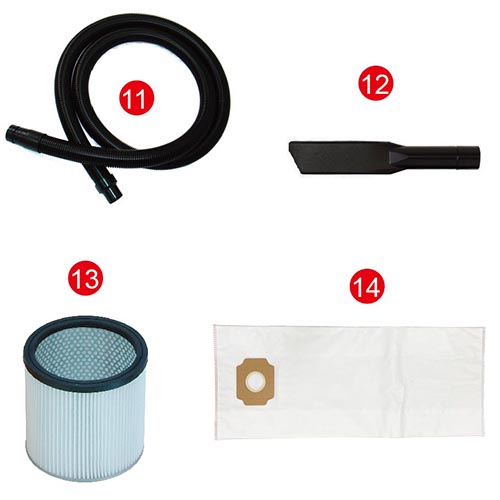 成品內部過濾耗材: 9) 紙過濾SH-180 (Φ188*H180mm/橘/紙)*1只 10) 布過濾袋(布A/JS12.15系列用) *1只 ………………………………………………………………………………………………………………………………………… 選購配件: 11) 1.5〞軟管 (10尺/3M)+卡式大接頭+小接頭*1組(選配) 12) 1.5〞扁吸嘴 (小接頭用/ L300mm)*1支(選配) 13) HEPA高密度過濾器(Φ188*H180mm/白/可水洗) *1只(選配) 14) 124集塵布袋(830*350mm/白) (吸粉塵用)*1只(選配) ………………………………………………………………………………………………………………………………………… 15) 151三通(白鐵/L290mm)*1只(選配) 16) 1.5”小接頭*2只(選配) 17) 1.5”軟管(5尺/1.5M)*1條(選配) ………………………………………………………………………………………………………………………………………… |