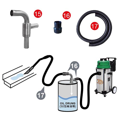 ………………………………………………………………………………………………………………………………………… 標準配件: 1) 1.5〞軟管 (10尺/3M)+卡式大接頭*1組 2) 1.5〞握把式彎管 (L460mm)*1支 3) 1.5”直管 (L500mm)*2支 4) 1.5〞主吸嘴 (L400*W49mm)*1只 5) 1.5〞扁吸嘴(彎管用/ L271mm) *1支 6) 1.5〞圓毛刷 (H105mm)*1只 7) 1.5〞橡刷片 (L347mm)*2只 8) 黑色收納袋*1只