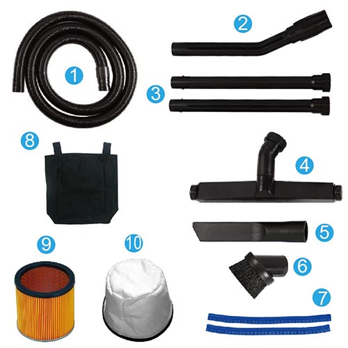 成品內部過濾耗材: 9) 紙過濾SH-180 (Φ188*H180mm/橘/紙)*1只 10) 布過濾袋(布A /JS12.15系列用) *1只 ………………………………………………………………………………………………………………………………………… 選購配件: 11) 1.5〞軟管 (10尺/3M)+卡式大接頭+小接頭*1組(簡單配件) 12) 1.5〞扁吸嘴 (小接頭用/ L300mm)*1支(簡單配件) 13) HEPA高密度過濾器(Φ188*H180mm/白/可水洗) *1只(選配) 14) 124集塵布袋(830*350mm/白) (吸粉塵用)*1只(選配) ………………………………………………………………………………………………………………………………………… |